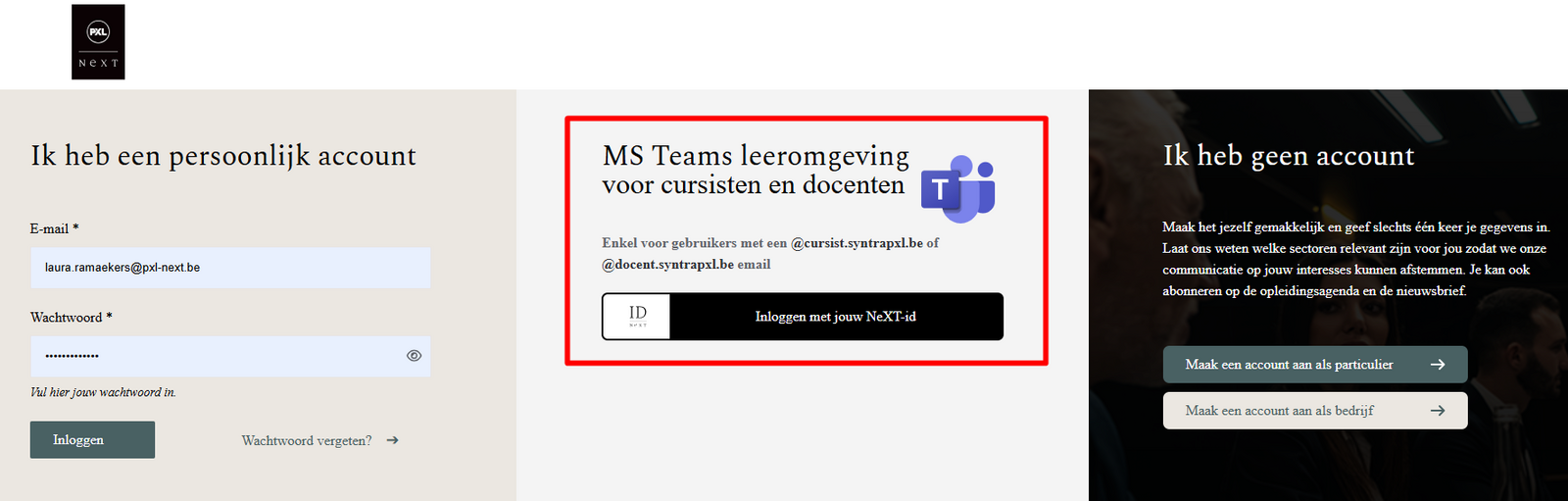 Op zoek naar het docentenportaal? In jouw Login | PXL-NeXT kan je links de directe link vinden naar dit platform.