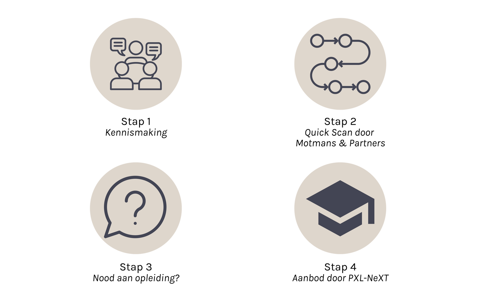 Om een passend antwoord te bieden op deze groeiende vraag heeft PXL-NeXT de handen in elkaar geslagen met Motmans & Partners, een organisatie gespecialiseerd in HR. Dankzij deze samenwerking kunnen we onze klanten nog beter ontzorgen in het detecteren van opleidingsnoden en het uitwerken van een maatgericht en opleidingsprogramma.
